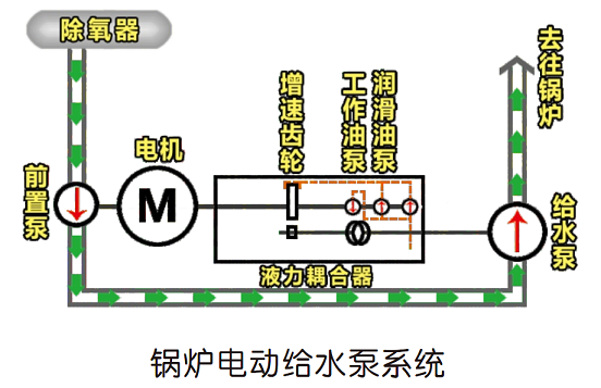 鍋爐電動(dòng)給水泵系統由前置泵、電動(dòng)機、液力耦合器、給水泵組成。系統根據機組負荷變化,通過(guò)液力耦合器調節給水泵供水量的大小,以滿(mǎn)足鍋爐生產(chǎn)系統供水需求。