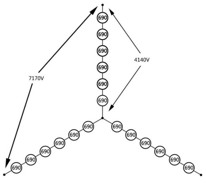 VFPS系列岸電電源系統采用功率單元串聯(lián)的形式,電壓疊加的原理類(lèi)似于“電池組疊加”技術(shù)。當需要6.6kV輸出時(shí),每相串聯(lián)6個(gè)功率單元,每個(gè)功率單元輸出的交流有效值為634V,相電壓3810V,線(xiàn)電壓6600V。每個(gè)單元最高可以輸出690V,系統最高可以輸出7170V。