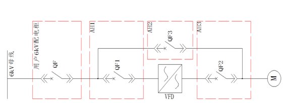 QF1為變頻器輸入斷路器,QF2為變頻輸出斷路器,QF3為工頻旁路斷路器;