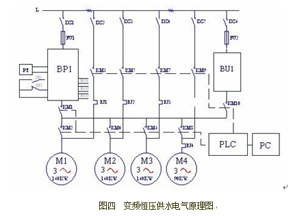 四川遂寧市自來(lái)水二廠(chǎng),供水能力6萬(wàn)噸/日,城市管網(wǎng)壓力0.4MPa,泵組為3臺160kW,1臺90kW水泵,要求恒壓供水并采用計算機監控,變頻器或控制系統故障可由軟起動(dòng)器手動(dòng)起動(dòng)各泵。