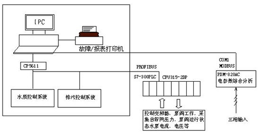 為保證系統的可靠性,上位機PC用于管理,用組態(tài)軟件做出若干工藝流程圖,實(shí)時(shí)顯示系統的運行狀況,并統計歷史數據,如需要可隨時(shí)打印報表;還用于故障的報警和處理。PC機為研華工業(yè)計算機,PLC為西門(mén)子S-7300,便于與總控室計算機聯(lián)網(wǎng),采用帶有PROFIBUS接口的CPU315。CP5611是通信模塊,PDM-820AC電參數綜合分析儀用于檢測系統的用電量??刂扑玫钠?停,切換,閥的啟/閉;電機電流,溫度的檢測,水泵使用時(shí)間的統計;壓力,流量,水質(zhì)參數的采集等,均由PLC完成。水壓的給定值由變頻器鍵盤(pán)設定。