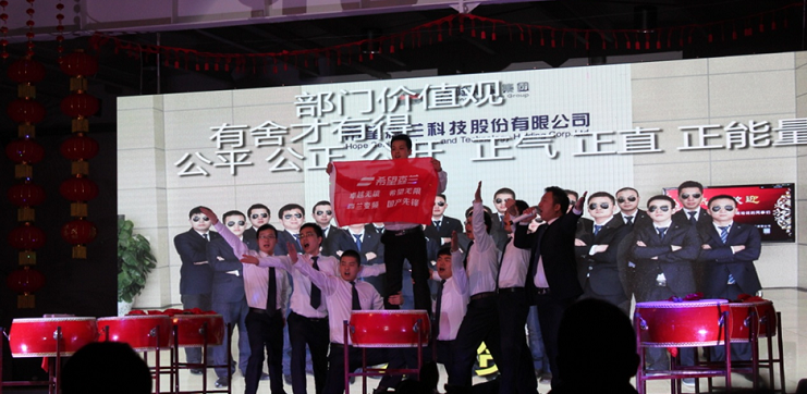詩(shī)朗誦《沁園春·雪》配合書(shū)法“俱往矣,數風(fēng)流人物,還看今朝?!贝髿獍蹴?,既贊美了祖國山河的雄偉多嬌,又抒發(fā)了希望森蘭以“變”贏(yíng)未來(lái)的抱負。邊跳邊唱的《七月火把節》歌調熱情豐富,滲透著(zhù)一種“狂歡化”的團結精神,傳達著(zhù)森蘭人積極向上的思想觀(guān)念和素樸的生活態(tài)度??偨?jīng)理及高管合唱《壯志在我胸》,管那山高水也深,也不能阻擋我奔前程,為破局2017積蓄能量。